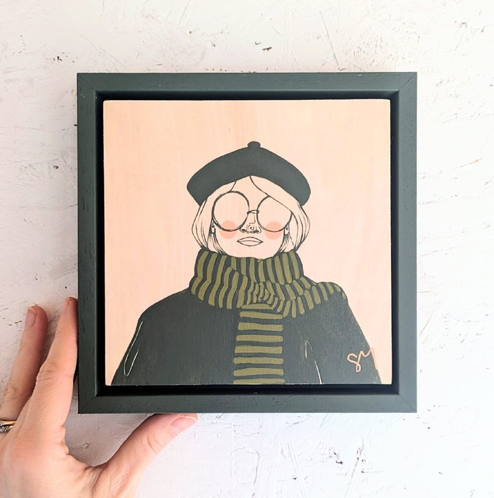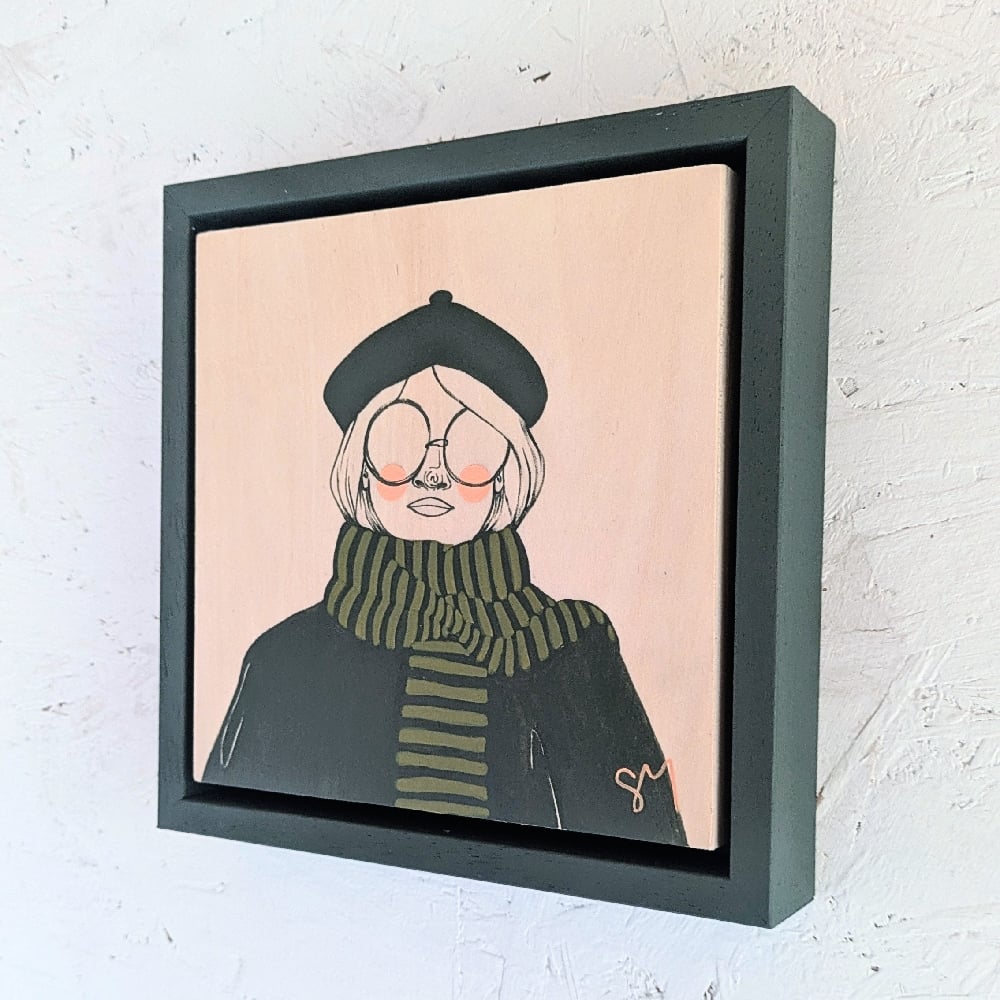 Original gouache acrylic on wood panel, framed.
